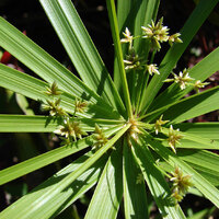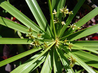 Descripció: Herba perenne, similar al papir, formadora de mates de diverses tiges que sorgeixen de rizomes (tiges subterrànies) i tiges aèries d¿1-1,5 m rígides, amb secció triangular, d'un verd fosc. Fulles basals, limitades a beines verdes que abracen la base de la tija. Inflorescència en espiga, amb bràctees ben desenvolupades, semblants a fulles, de 15-35 × 1-1,5 cm, que formen grups de 10-25 en disposició umbel·lada i radial, com les barnilles d'un paraigua, més llargues que la inflorescència, que consta de 15-25 grups pedicel·lats, també radials, de 8-15 espiguetes cadascun; espiguetes llargues i primes, de 15-30 flors cadascuna, cobertes per 2 rengleres de bràctees brunes, que equivalen a les peces florals. Flors hermafrodites, molt simplificades, amb androceu de 3 estams i gineceu de 3 carpels i 3 estigmes. Fruit en aqueni, bru i trígon.