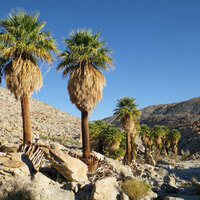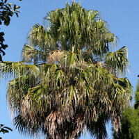 Descripció: Palmera de fins a 20 m, amb tronc (estípit) amb petites marques de fissures rugoses (cicatrius de les fulles) o parcialment cobert per restes foliars, amb la base eixamplada. Fulles palmatisectes, amb forma de ventall (flabel·liformes), esparses, amb limbe de 3,5-4 m i pecíols de 2 m. Inflorescència en raïm pèndul. Flors hermafrodites, trímeres, flairoses, amb 3 sèpals soldats, 3 pètals soldats de color crema, androceu de 6 estams i gineceu tricarpel·lar. Fruit en drupa, de 0,6 cm de diàmetre, el·líptic o ovoide, negrós.