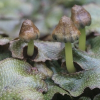 Descripció: Hepàtica dioica amb la generació haploide (gametòfit) que forma denses làmines amb tal·lus de fins a 15-20 de longitud i 1-2 cm d'amplada, lingüiformes, plans, lobulats dicotòmicament, verds, que als marges o a les plantes més velles poden arribar a ser de color marró o púrpura. Al revers hi tenen uns rizoides de fixació al substrat, i a l'anvers el tal·lus és reticulat i a primera vista s'hi observen uns porus aerífers al centre de cada reticle. Els tal·lus es poden fragmentar i se'n poden dispersar propàguls apicals vegetativament, impulsats pels esquitxos de l'aigua. Als àpexs dels tal·lus també s¿hi formen els òrgans sexuals (receptacles), segons el gènere: els individus mascles en fan de masculins, sèssils, aplanats, bruns, que produeixen gàmetes masculins (anteridis); les femelles en fan sobre un pedicel, i produeixen gàmetes femenins (arquegonis). Un cop fecundats, els arquegonis es transformen en la generació diploide (esporòfit), de vida relativament curta, menys freqüent i constituïda per esporangis, petits barrets de forma cònica (origen de l'epítet específic) al capdamunt dels pedicels que segueixen creixent sobre el tal·lus; els esporangis alliberen espores impulsades per uns filaments que actuen com molles elàstiques (elàters); aquestes espores donen lloc a nous gametòfits.