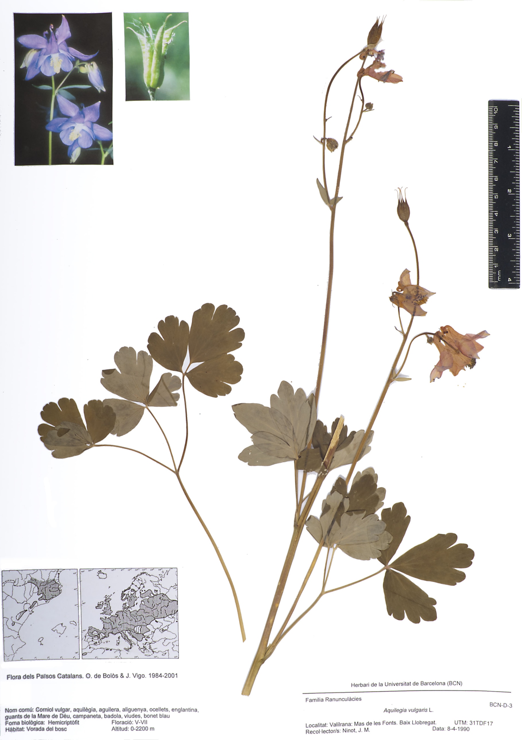 Part de Aquilegia vulgaris L. (Corniol vulgar, aquilègia, aguilera, aliguenya, ocellets, englantina, guants de la Mare de Déu, campaneta, badola, viudes, bonet blau)