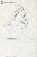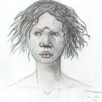 Cap tatuat de dona de l'ètnia fang. Proves de maquetació per a un article publicat al suplement Ciència de «La Vanguardia» l'any 1990. |