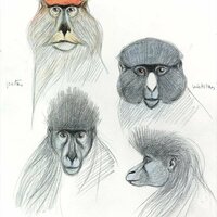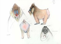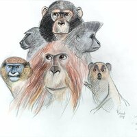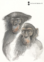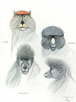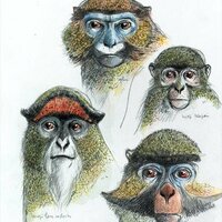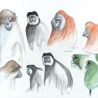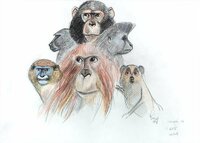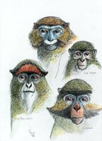 Dibuix de dos orangutans, tres cercopitecs de De Brazza, tres còlobs i dos mangabeis de collar. |