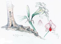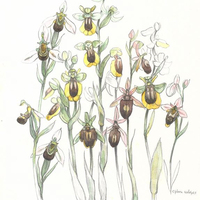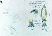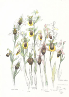 Descripció: Dibuix d'un conjunt de diferents espècies d'orquídia amb detall de les seves flors, de Santa Maria d'Oló (Catalunya).