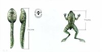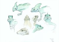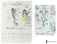 Descripció: Dibuix de dos capgrossos i de la granota al final de la metamorfos, del Río Mbia.