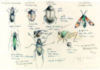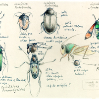 Descripció: Dibuix de vuit espècies d'insectes entre coleòpters, hemípters i papallones amb anotacions manuscrites de cadascuna, fet a Mbini (Guinea Equatorial).