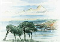 Descripció: Paisatge del golf de Roses amb uns quants pins en primer terme.