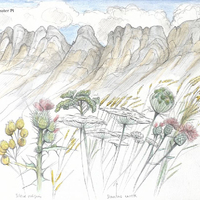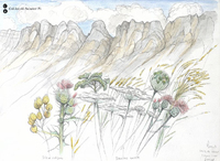 Descripció: Dibuix d'un conjunt de cinc plantes diferents, amb detall de cadascuna de les seves flors, de Canalroya (Aragó).