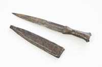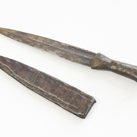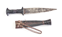 Objecte etnogràfic. Espasa fang decorada de metall, amb un mànec de fusta i amb una funda molt treballada. Procedent de la regió de Bibeiny. |