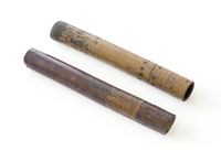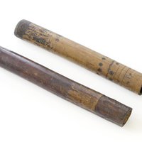 Descripció: Objectes etnogràfics de 3,5 cm de diàmetre. Dues flautes del culte funerari «Melan» dels fang ntumu.