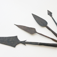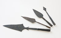 Descripció: Objectes etnogràfics. Quatre puntes de llances de diverses mides (24, 27, 30 i 43 cm) i formes procedents de l'ètnia fang.