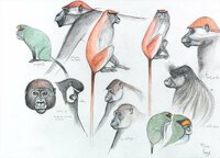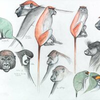 Descripció: Dibuix de tres cercopitecs de De Brazza, quatre mangabeis de collar, dues mones vermelles, un mangabei de cresta, un còlob de crinera oriental i un goril·la.