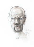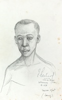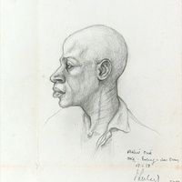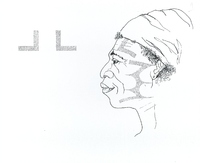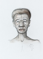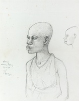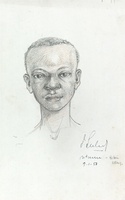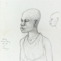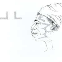 Descripció: Cap tatuat d'home de l'ètnia fang. Proves de maquetació per a un article publicat al suplement Ciència de «La Vanguardia» l'any 1990.