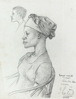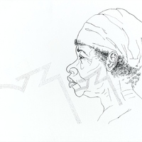 Descripció: Cap tatuat de dona de l'ètnia fang. Proves de maquetació per a un article publicat al suplement Ciència de «La Vanguardia» l'any 1990.