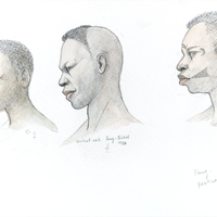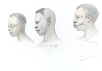 Descripció: Dos caps tatuats d'homes i un de dona de l'ètnia fang-esseng.