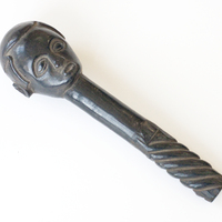 Descripció: Objecte etnogràfic. Mànec de bastó de comandament fang amb cap d'home procedent de la regió de Bibeiny.