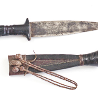 Objecte etnogràfic. Ganivet fang amb funda i mànec de pell procedent de la regió de Mbini. |