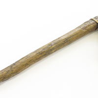 Descripció: Objecte etnogràfic. Aixada amb mànec de fusta amb la fulla metàl·lica subjecta gràcies a l'encaix i una tira vegetal pertanyent a l'ètnia fang.