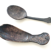 Objectes etnogràfics. Dues culleres de fusta de l'ètnia fang procedents de la regió de Bibeiny. |