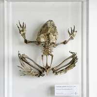 Descripció: Esquelet complet de granota gegant (Conraua goliath) procedent de les cascades del riu Mbia. En posició dreta amb les extremitats posteriors arronsades. Restauració i muntatge a càrrec del Centre de Recursos de Biodiversitat Animal de la Universitat de Barcelona.