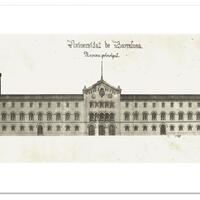L'any 1860 l'arquitecte Elias Rogent va fer els primers croquis del nou edifici de la Universitat. En principi es volia construir en el mateix indret en què s'impartien les classes des de la tornada de la Universitat a Barcelona, és a dir, al convent del Carme, situat al carrer del Carme, cantonada amb el carrer dels Àngels. Finalment es va ubicar en el nou Eixample de Barcelona; aquest canvi d'ubicació va permetre ampliar la superfície construïda gràcies, sobretot, a una major fondària, tot i que el projecte definitiu és ben semblant a l'original. L'edifici no es va acabar fins gairebé un quart de segle després de l'elaboració d'aquells primers croquis, concretament el 1884. De la configuració de l'edifici destaca, tant a la planta com a la façana, l'ús de la simetria, que situa al seu eix un cos central flanquejat per dos de laterals idèntics. En el cos central es va ubicar la dependència que per a Rogent representa l'ànima o l'essència de la Universitat i que la caracteritza amb més força: el Saló de Graus o Paranimf. La façana d'aquest cos central presenta una major decoració i una alçada superior a la dels laterals. Per al disseny dels dos cossos laterals, Elias Rogent va seguir els principis arquitectònics que l'arquitecte italià Francesco Milizia considerava propis d'una universitat: ordenació de les dependències al voltant d'un claustre, situació de les aules al primer pis i de la biblioteca al segon, i elevació de dues torres, que en el cas de la Universitat de Barcelona es van construir als costats.