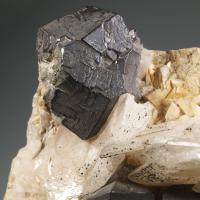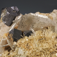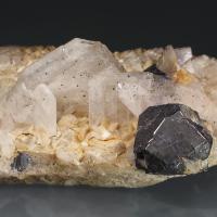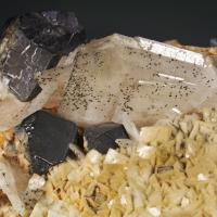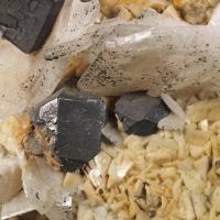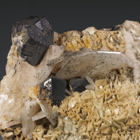 Specimen combining cubo-octahedra of galena, baryte and dolomite from one of the most renowned mining areas of Catalonia. The largest crystal of galena measures 3 cm on the edge.