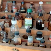 Wooden box containing several bottles with chemical reagents.