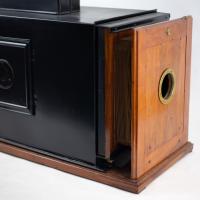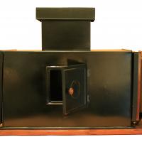 Sobre una base rectangular de fusta hi ha muntat el cos del projector, el qual conté una porta lateral i, a la part superior, una xemeneia. A la part frontal hi ha una placa de fusta, amb una rosca per col·locar-hi una lent. A més, es pot regular la distància de la placa respecte al cos de llautó. Falten la font de llum i l’objectiu. La part del suport de les transparències de vidre és de fusta i té un placa amb una L i una M gravades, que són característiques de la marca DeMaria-Lapierre, París.