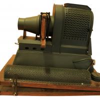 Una base reclinable de fusta actua d’orientador. A sobre hi ha el projector. A la part dreta hi ha les connexions per a la bombeta. A la part esquerra hi ha el projector, que, abans del col·limador, té el sistema lliscant de dos trams, de fusta. A la sortida hi ha una rosca per poder afegir-hi lents. La font de llum és una bombeta de grans dimensions, amb la marca Mazda nº 29 b. La base reclinable té una gran resistència, que feia de divisor de tensió per tal de rebaixar la tensió a un voltatge més baix (probablement a 30 volts). El portatransparències, de fusta, ja presenta la innovació de tenir capacitat per a dues transparències, cosa que permet canviar-ne una mentre l’altra es projecta. Les dimensions de les plaques de vidre són de 75 × 95 mm. En bon estat de conservació.