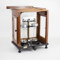 Es troba a l’interior d’una vitrina de vidre i fusta per evitar que corrents d’aire afectin les mesures. La capsa conté blocs de peces de fins a un gram i làmines d’alumini de fins a un mil·ligram.