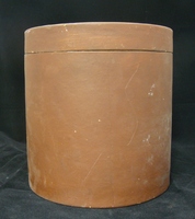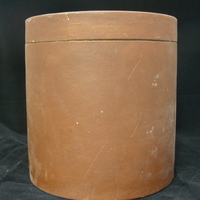 Descripció: Capsa cilíndrica de cartró amb tapadora, de color marró, de 22 cm d'alçada i 20,5 de diàmetre. Recipient on la casa Escuder (J. Escuder) servia la "Lanolina" (usada per a fer medicaments a la farmàcia).