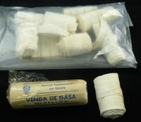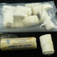 Descripció: Material sanitari (benes, gases de cotó) procedent d'un botiquí militar. Una d'elles té l'envoltori "Servicio Farmacéutico del Ejército".
