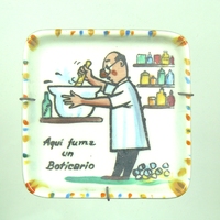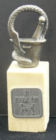 Descripció: Objecte publicitari dels Laboratoris Leo de Barcelona consistent en l'emblema de la Farmàcia - format per un morter platejat rodejat per una serp. El conjunt es troba incrustat en una petita columna de pedra.