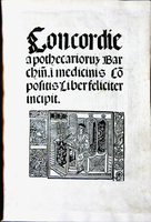 Descripció: L'edició de 1511 de la «Concordia Apothecatiorum Barchiñ», la primera farmacopea catalana i la segona d'Europa, és un volum escrit en llatí amb caràcters gòtics. Està feta de paper fort amb alguns fulls amb filigrana de mà oberta de la qual surt una flor pedunculada de cinc pètals. És l'únic exemplar de la Concòrdia de 1511 que es conserva al món. La Concordia, impecablement impresa, consta de 87 pàgines amb algun error de numeració. El contingut farmacèutic de l'obra comença amb la transcripció de la recepta de l'Electuarium de aromatibus secundum Ebenmesue, encapçalada amb la inicial de «Recipe» damunt d'un fons de belles filigranes. Ressalta la luxosa orla que adorna la pàgina, riquesa gràfica que, tanmateix, no es manté a les pàgines successives. L'exemplar, restaurat per Vellina i magníficament enquadernat per Emili Brugalla, es conserva al Museu de la Farmàcia Catalana de la Facultat de Farmàcia de la UB.