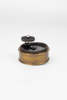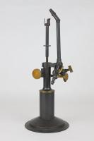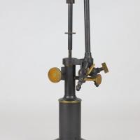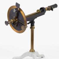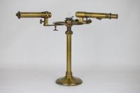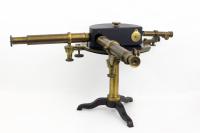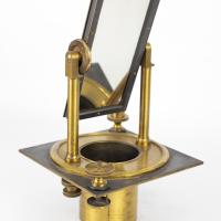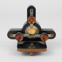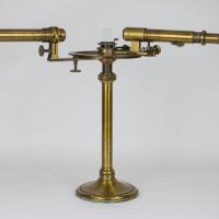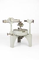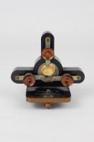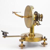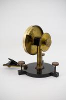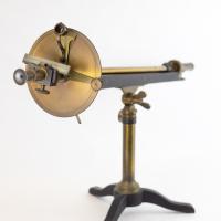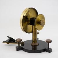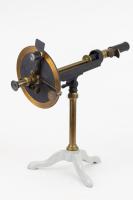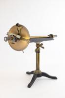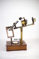 Instruments científics Patrimoni moble - Eines i equips - Òptica FFUB-0179 Goniòmetre de Wollaston Goniòmetre Òptica Desenvolupat per Wollaston (1766–1828) el 1809, utilitzat en mineralogia, de gran utilitat per mesures d’angles entre les cares dels cristalls. Per a aquest propòsit el cristall es muntava sobre un eix horitzontal graduat i que podia girar. Observant la imatge reflectida d’un objecte llunyà es prenia nota de la lectura de l’angle i tot seguit es feia girar fins veure en l’altre cara el mateix objecte. La diferència de lectures indicava l’angle. També és conegut com goniòmetre de reflexió de Wollaston. La precisió és de 3 minuts. Deyrolle 1860-1890 1860 1890 16 x 16 x 18 cm Llautó París, França Facultat de Física. Martí i Franquès, 1-11, 08028 Barcelona Despatx V407 (antic Ferrater) Desconeguda Bo Reserva (magatzem) Protegit per dret d'autor No Santiago Vallmitjana Rico, Departament de Física Aplicada, UB|Joan Manel Hernández, Departament de Física de la Matèria Condensada, UB