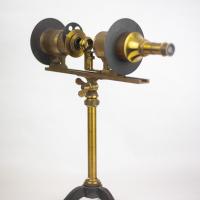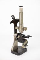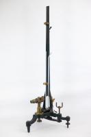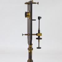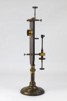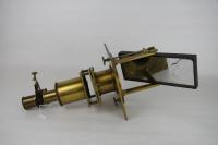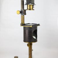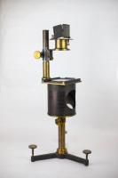 Instruments científics Patrimoni moble - Eines i equips - Astronomia FFUB-0175 Microscopi solar i accessoris Microscopi Òptica El microscopi solar és, en realitat, una llanterna màgica il·luminada pels raigs del sol. Es treballa en una cambra fosca i la llum del sol penetra a través d’una finestreta adequada al tub de l’instrument, que està proveït d’un mirall que queda a l’exterior. Els raigs del sol cauen sobre el mirall pla i es reflecteixen cap a una lent de condensació que els concentra sobre la mostra o portaobjectes. A continuació, un objectiu projecta la imatge a la paret oposada. Com que la direcció de la llum del sol és contínuament variable, la posició del mirall també s’ha de canviar, mitjançant dues rodetes, de manera que la reflexió està sempre en la direcció de l’eix del microscopi. J. Salleron 1870-1900 1870 1900 60 x 21,5 x 30 cm Llautó|Vidre (material) París, França Facultat de Física. Martí i Franquès, 1-11, 08028 Barcelona Despatx V533 Desconeguda Bo Reserva (magatzem) http://bdh-rd.bne.es/viewer.vm?id=0000237980&page=590|http://bdh-rd.bne.es/viewer.vm?id=0000232065&page=389|http://bdh-rd.bne.es/viewer.vm?id=0000131786&page=271 Protegit per dret d'autor No Santiago Vallmitjana Rico, Departament de Física Aplicada, UB|Joan Manel Hernández, Departament de Física de la Matèria Condensada, UB