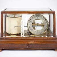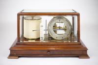 Instruments científics Patrimoni moble - Eines i equips - Mesurament|Patrimoni moble - Eines i equips - Meteorologia FFUB-0180 Barògraf aneroide setmanal Barògraf aneroide Meteorologia És un baròmetre aneroide amb mecanisme d’enregistrament. Les variacions de la pressió atmosfèrica s’enregistren mitjançant les variacions d’unes càpsules de llauna ondulades en sèrie en les que s’ha fet el buit. Aquestes variacions comuniquen amb un braç i una ploma entintada a un paper col·locat a un tambor que gira per un mecanisme de rellotge de corda, que fa un gir cada setmana. Short & Mason Ltd. 1900-1930 1900 1930 36 x 22 x 21 cm Llautó|Vidre (material)|Fusta Londres, Regne Unit Facultat de Física. Martí i Franquès, 1-11, 08028 Barcelona Despatx 502 (S. Vallmitjana) Desconeguda Bo Reserva (magatzem) te una inscripció que posa "Ro N 428606" Short and Mason Ltd: Established in 1875 by Thomas Short and James Mason as Short & Mason, trading at 40 Hatton Garden, London, They made and sold barographs, aneroid barometers, compasses, aviation instruments such as altimeters, indicators and gauges. Protegit per dret d'autor No Santiago Vallmitjana Rico, Departament de Física Aplicada, UB|Joan Manel Hernández, Departament de Física de la Matèria Condensada, UB