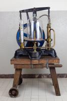 Instruments científics Patrimoni moble - Eines i equips FFUB-0186 Màquina pneumàtica Eina pneumàtica Mecànica La seva funció principal és fer el buit a la campana que incorpora. També es fa servir per modificar l’entorn en què es troben determinats gasos continguts en aquesta campana. Tot i així, no es pot extreure tot l’aire que conté, ja que sempre en resta de residual. Max Kohl Vora 1890 1880 1900 60 x 65 x 70 cm Llautó|Vidre (material)|Acer|Cuir (adob) Chemnitz, Alemanya Facultat de Física. Martí i Franquès, 1-11, 08028 Barcelona Passadis Antic Planta 4 Desconeguda José Maria Herrero Edo - Fac. de Física, U.B., Barcelona, Espanya, 2009 Regular (possible tractament) Reserva (magatzem) Protegit per dret d'autor No Santiago Vallmitjana Rico, Departament de Física Aplicada, UB|Joan Manel Hernández, Departament de Física de la Matèria Condensada, UB