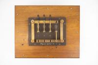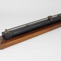 Instruments científics Patrimoni moble - Eines i equips - Electricitat i magnetisme|Patrimoni moble - Eines i equips - Mesurament FFUB-0196 Pont de fil Artefacte de mesurament d'electricitat Electromagnetisme P. Agustí Vora 1890 1880 1900 46 x 8 x 7 cm Ferro (metall)|Fusta|Coure (metall) Barcelona, Espanya Facultat de Física. Martí i Franquès, 1-11, 08028 Barcelona Sala de Juntes Desconeguda Bo Reserva (magatzem) Protegit per dret d'autor No Santiago Vallmitjana Rico, Departament de Física Aplicada, UB|Joan Manel Hernández, Departament de Física de la Matèria Condensada, UB