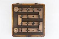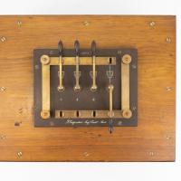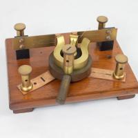 Instruments científics Patrimoni moble - Eines i equips - Electricitat i magnetisme FFUB-0166 Commutador Bertin Commutador elèctric Electromagnetisme Es tracta d’un dispositiu de contactes múltiples que permet invertir els pols d’un circuit de manera ràpida i precisa. E. Ducretet & Cie 1860-1890 1860 1890 20 x 19 x 9 cm Llautó|Fusta París, França Facultat de Física. Martí i Franquès, 1-11, 08028 Barcelona Sala de Juntes Desconeguda Bo Reserva (magatzem) Ganot A. "Tratado elemental de física experimental y aplicada y de meteorología", 8 ed. Paris, J. B. Bailliere, 1880, p. 736 Protegit per dret d'autor No Santiago Vallmitjana Rico, Departament de Física Aplicada, UB|Joan Manel Hernández, Departament de Física de la Matèria Condensada, UB