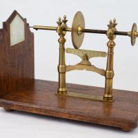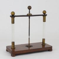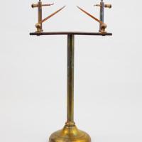 Instruments científics Patrimoni moble - Eines i equips - Electricitat i magnetisme FFUB-0168 Travessanaips Artefacte experimental (electroestàtica) Electromagnetisme Descripció general: Aparell per fer demostracions dels efectes d’una espurna elèctrica. És capaç de foradar un paper o un naip situat a la peça central mitjançant una espurna elèctrica. Funcionament: Consta de dues agulles conductores acabades en punta per on saltarà l’espurna elèctrica. Generalment, per alimentar aquest dispositiu es feia servir la càrrega emmagatzemada en una ampolla de Leiden, que es descarregava bruscament. Dades històriques: Es tracta d’un aparell de la segona meitat del segle XIX (1860-1890). Desconegut 1860-1870 1860 1870 18 x 9 x 22 cm Llautó|Vidre (material)|Fusta Desconegut Facultat de Física. Martí i Franquès, 1-11, 08028 Barcelona Vestíbul Planta 1 Desconeguda Bo Exposició "Electromagnetisme" - Facultat de Física - Universitat de Barcelona (Barcelona, Barcelonés, Barcelona, Espanya) - a partir del 22 setembre de 2022 Ganot A. "Tratado elemental de física experimental y aplicada y de meteorología", 8 ed. Paris, J. B. Bailliere, 1880, p. 657, 686 També anomenat trepana-vidres (taladra-vidrios) o trepant d'espurna elèctrica Protegit per dret d'autor Santiago Vallmitjana Rico, Departament de Física Aplicada, UB|Joan Manel Hernández, Departament de Física de la Matèria Condensada, UB