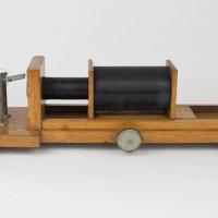 Instruments científics Patrimoni moble - Eines i equips - Electricitat i magnetisme FFUB-0238 Bobina variable Bobina d'inducció Electromagnetisme Descripció general: Consta d’un fil de coure enrotllat al voltant d’un cilindre. On es pot connectar cada extrem o bé a un generador de corrent o bé a algun aparell de mesura per tancar el circuït. Aquesta bobina en concret permet variar la inductància reduint la longitud del fil. Funcionament: Al passar un corrent elèctric es genera un camp magnètic a l’eix de la bobina o també es pot generar un corrent d’inductància mitjançant un camp magnètic variable. Desconegut 47,5 x 14 x 13,5 cm Ferro (metall)|Fusta|Coure (metall) Desconegut Facultat de Física. Martí i Franquès, 1-11, 08028 Barcelona Sala de Juntes Desconeguda Bo Reserva (magatzem) Protegit per dret d'autor No Santiago Vallmitjana Rico, Departament de Física Aplicada, UB|Joan Manel Hernández, Departament de Física de la Matèria Condensada, UB