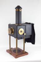 Instruments científics Patrimoni moble - Mobiliari i decoració - Làmpades i objectes d'il·luminació FFUB-0049 Llanterna màgica (font puntual variable) Llanterna màgica Òptica La llanterna funciona per arc voltaic entre dos elèctrodes de carbó a 100 V. Els elèctrodes es troben a l’interior de l’estructura, la qual té una obertura al darrere i dues obertures laterals. Per l’obertura posterior es pot accedir al sistema de rodes que varien la posició d’un dels elèctrodes. Si se n’observa la base, es veu que el sistema d’il·luminació inicial (probablement d’oli o de petroli) es va modificar per un arc voltaic. La llum es controlava mitjançant un disc giratori de tipus revòlver amb diversos diafragmes. Instrument complet. En bon estat de conservació. Desconegut 1870-1890 1870 1890 50 x 36 x 87 cm Llautó|Acer|Fusta Desconegut Facultat de Física. Martí i Franquès, 1-11, 08028 Barcelona Sala del Deganat Desconeguda Roman Magrans Geis, 1987-1995 Bo Reserva (magatzem) "Nikola Tesla - El Geni de l'electricitat moderna" - Museu de la Ciència - CosmoCaixa (Barcelona, Barcelonés, Barcelona, Espanya) - del 29 d'octubre de 2021 al 13 de febrer de 2022 Ganot A. "Tratado elemental de física experimental y aplicada y de meteorología", 8 ed. Paris, J. B. Bailliere, 1880, p. 541-542|VIII Trobada d'història de la ciència i de la tècnica, p. 541-542 Protegit per dret d'autor No Santiago Vallmitjana Rico, Departament de Física Aplicada, UB|Joan Manel Hernández, Departament de Física de la Matèria Condensada, UB