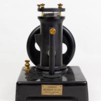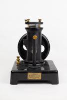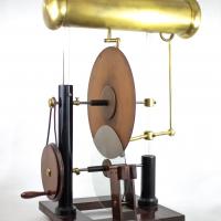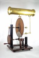 Instruments científics Patrimoni moble - Eines i equips - Electricitat i magnetisme FFUB-0090 Rotor per a tubs de descàrrega Electròmetre Electromagnetisme Descripció general: Els tubs de descàrrega de Geissler contenien gasos amb bona conductivitat (com Argó, Neó o, fins i tot, Mercuri) pels quals es feia circular un corrent elèctric de forma que es produïa un efecte anomenat descàrrega luminescent, molt semblant a les llums de neó. A aquest rotor li falta el pròpia tub, sovint tenien formes enrevessades i cridaneres per produir efectes més sorprenents creant figures lluminoses de revolució. Funcionament: Presenta un motor elèctric que fa girar (que utilitza una màquina electrostàtica com l’instrument FFUB-0075) el tub de Geissler i aporta electricitat als elèctrodes situats a ambdós extrems del tub. Dades històriques: Aquest tipus de mecanismes van obtenir certa popularitat a finals del segle XIX i va acabar convertint-se en un negoci de llums de neó cap al 1910. Amb els recents avanços tecnològics pel que fa a l’electricitat, es tractava d’una forma sorprenent d’exposar l’ús de l’electricitat, en un context òbviament no acadèmic. En aquell moment, el concepte d’un motor elèctric ja era per si sol una cosa nova i fascinant. Ideats pel físic i bufador de vidre alemany Heinrich Geissler (1814-1879) l’any 1857. Desconegut 1870-1900 1870 1900 19 x 49 x 54 cm Llautó|Vidre (material)|Fusta|Coure (metall) Desconegut Facultat de Física. Martí i Franquès, 1-11, 08028 Barcelona Sala del Deganat Desconeguda Roman Magrans Geis, 2007-2008 Bo Reserva (magatzem) Protegit per dret d'autor No Santiago Vallmitjana Rico, Departament de Física Aplicada, UB|Joan Manel Hernández, Departament de Física de la Matèria Condensada, UB