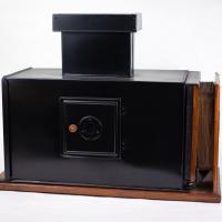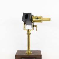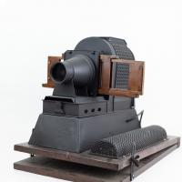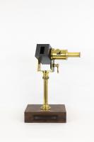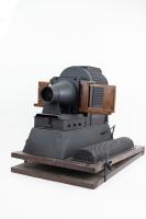 Instruments científics Patrimoni moble - Expressió i comunicació - Comunicació audiovisual|Patrimoni moble - Expressió i comunicació - Fotografia FFUB-0050 Projector de transparències Projector d'imatges Òptica Sobre una base rectangular de fusta hi ha muntat el cos del projector, el qual conté una porta lateral i, a la part superior, una xemeneia. A la part frontal hi ha una placa de fusta, amb una rosca per col·locar-hi una lent. A més, es pot regular la distància de la placa respecte al cos de llautó. Falten la font de llum i l’objectiu. La part del suport de les transparències de vidre és de fusta i té un placa amb una L i una M gravades, que són característiques de la marca DeMaria-Lapierre, París. Desconegut 1860-1900 1860 1900 68 x 27 x 51 cm Llautó|Fusta|Cartró (paper) Desconegut Facultat de Física. Martí i Franquès, 1-11, 08028 Barcelona Sala de Juntes Desconeguda Roman Magrans Geis, 1987-1995 Bo Reserva (magatzem) Protegit per dret d'autor No Santiago Vallmitjana Rico, Departament de Física Aplicada, UB|Joan Manel Hernández, Departament de Física de la Matèria Condensada, UB