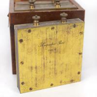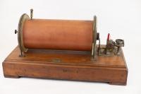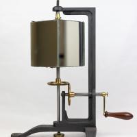 Instruments científics Patrimoni moble - Eines i equips|Patrimoni moble - Eines i equips - Mesurament FFUB-0066 Manòmetre registrador per a gasos Manòmetre Termodinàmica Descripció general: Instrument que mesura la pressió de gasos i ho enregistra en un paper situat sobre un tambor giratori. L’entrada lateral amb clau de pas s’utilitza per introduir un gas al recipient interior. Funcionament: Es basa en un baròmetre aneroide en que les variacions de presió a l'exterior produeixen deformacions en la forma d'una cavitat estanca (la càpsula aneroide) en la que s'ha fet un buit parcial i que està a una pressió de referència. Dades històriques: Fabricat per Richard Frères a finals del segle XIX (1880-1900) a França. zat. Les làmines prenen càrregues idèntiques, però de signe oposat i se separen en un angle proporcional a la càrrega induïda pel cos carregat. Dades històriques: Ideat pel físic italià Alessandro Guiseppe Antonio Anastasio Volta (1745-1827). Richard Frères 1880-1900 1880 1900 37 x 22 x 43 cm Llautó|Vidre (material)|Fusta|Cautxú (resina) París, França Facultat de Física. Martí i Franquès, 1-11, 08028 Barcelona Sala del Deganat Desconeguda Roman Magrans Geis, 2006-2007 Bo Reserva (magatzem) El tambó no conté paper. Protegit per dret d'autor No Santiago Vallmitjana Rico, Departament de Física Aplicada, UB|Joan Manel Hernández, Departament de Física de la Matèria Condensada, UB