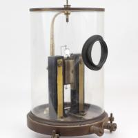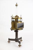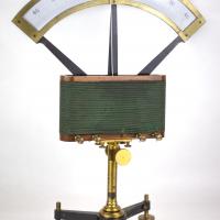 Instruments científics Patrimoni moble - Eines i equips - Electricitat i magnetisme FFUB-0109 Galvanòmetre de Thomson Galvanòmetre|Instrument de mesura (instrument) Electromagnetisme Descripció general: En general, els galvanòmetres mesuren la intensitat de corrent i la seva direcció (mitjançant la llei d'Ampere). Fonamentalment formats per una agulla rodejada d'una espira metàl·lica sobre una base de fusta. Abans de fer qualsevol mesura s'ha de modificar la base fins que l'agulla apunti al zero i, per tant, estigui anivellada. Es poden classificar en galvanòmetres d’imant mòbil o de quadre mòbil segons si la peça mòbil és l’imant o el quadre de filferro. Funcionament: La característica que el diferència d'altres galvanòmetres és la barra imantada situada en la part superior de l'instrument. Permet moviments verticals per tal d'aconseguir neutralitzar l'acció del magnetisme terrestre. Dades històriques: Aquesta variació del galvanòmetre clàssic rep el seu nom del físic del segle XIX WiIlliam Thomson, deprés conecut com a Lord Kelvin (1824-1907). E. Ducretet 1870-1900 1870 1900 16 x 16 x 54 cm Llautó|Vidre (material) París, França Facultat de Física. Martí i Franquès, 1-11, 08028 Barcelona Vestíbul Planta 1 Desconeguda Bo Exposició "Electromagnetisme" - Facultat de Física - Universitat de Barcelona (Barcelona, Barcelonés, Barcelona, Espanya) - a partir del 22 setembre de 2022 http://bdh-rd.bne.es/viewer.vm?id=0000237980&page=685 Protegit per dret d'autor Santiago Vallmitjana Rico, Departament de Física Aplicada, UB|Joan Manel Hernández, Departament de Física de la Matèria Condensada, UB