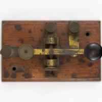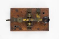 Instruments científics Patrimoni moble - Eines i equips - Telecomunicacions FFUB-0119 Manipulador de telègraf Telègraf Electromagnetisme Descripció general: En telegrafia, el manipulador és el dispositiu que, accionat per l’operador de l’estació transmissora, permet obrir i tancar el circuit de la línia telegràfica per compondre els missatges. Funcionament: Quan l’operador prem el pom, es produeix el tancament del circuit format per la molla, el braç del manipulador i el contacte, i dona lloc a la circulació de corrent per la línia telegràfica. Segons el codi Morse, el receptor interpreta la durada de la pulsació de la manera següent: si és molt curta, el senyal enviat s’entén com un punt, i si és més llarga, com una ratlla. Desconegut 1870-1900 1870 1900 15 x 10 x 7 cm Llautó|Fusta Desconegut Facultat de Física. Martí i Franquès, 1-11, 08028 Barcelona Vestíbul Planta 1 Desconeguda Bo Exposició "Electromagnetisme" - Facultat de Física - Universitat de Barcelona (Barcelona, Barcelonés, Barcelona, Espanya) - a partir del 22 setembre de 2022 Protegit per dret d'autor Santiago Vallmitjana Rico, Departament de Física Aplicada, UB|Joan Manel Hernández, Departament de Física de la Matèria Condensada, UB
