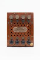 Instruments científics Patrimoni moble - Eines i equips - Electricitat i magnetisme FFUB-0121 Caixa de resistències per a multivoltímetre Resistències Electromagnetisme Weston Electrical Instruments Corp. 1880-1910 1880 1910 13 x 16,5 x 4 cm Llautó|Fusta Newark, EUA Facultat de Física. Martí i Franquès, 1-11, 08028 Barcelona Passadis Antic Planta 4 Desconeguda Bo Reserva (magatzem) Protegit per dret d'autor No Santiago Vallmitjana Rico, Departament de Física Aplicada, UB|Joan Manel Hernández, Departament de Física de la Matèria Condensada, UB