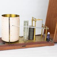 Instruments científics Patrimoni moble - Eines i equips - Mesurament|Patrimoni moble - Eines i equips - Meteorologia FFUB-0052 Barògraf aneroide setmanal Barògraf aneroide|Instrument de mesura (instrument) Meteorologia Descripció general: Un baròmetre, de forma general, permet trobar la pressió atmosfèrica. Històricament trobem dos tipus de baròmetres: els de mercuri i els metàl·lics (també anomenats aneroides). Els primers, més habituals abans de que sorgissin preocupacions per enverinament de mercuri, mesuren la pressió atmosfèrica mitjançant l’altura de la columna de mercuri (Torricelli). En canvi, els segons, mesuren la pressió a partir de les deformacions d’una caixa metàl·lica altament elàstica. Aquest és el nostre barògraf. Funcionament: Degut a la poca fiabilitat del material elàstic, és necessari calibrar l’instrument d’alguna forma, en aquest cas presenta un termòmetre en l’interior. Està ideat per a prendre mesures durant un cert període de temps, les quals es van registrant en un paper situat dins del cilindre giratori de l’esquerra i anotat per una ploma metàl·lica connectada a l’aparell. Un seguit de caixes d’aneroides superposades de gran elasticitat ens donen la deformació produïda per causa de la variació en la pressió atmosfèrica. Aquesta informació es transmet a l’agulla que anota les mesures contínuament. Tot i ser de petites dimensions no presenta una gran exactitud. Dades històriques: Rep el nom de baròmetre metàl·lic registrador de Richard Frères, com a col·laboració entre els francesos Jules Richard i el seu germà l’any 1876. Ambdós acabarien sent pioners de la indústria cinematogràfica. Desconegut 1902-1930 1902 1930 19 x 44 x 25 cm Llautó|Vidre (material)|Paper|Fusta Desconegut Facultat de Física. Martí i Franquès, 1-11, 08028 Barcelona Vitrina Fontseré Desconeguda Roman Magrans Geis, 1987-1995 Bo Exposició "Exposició permanent" - Facultat de Física - Universitat de Barcelona (Barcelona, Barcelonés, Barcelona, Espanya) - a partir del 22 setembre de 2022 https://collection.sciencemuseumgroup.org.uk/people/cp16590/richard-freres|http://bdh-rd.bne.es/viewer.vm?id=0000237980&page=261 També és conegut com a microbarògraf. Protegit per dret d'autor Santiago Vallmitjana Rico, Departament de Física Aplicada, UB|Joan Manel Hernández, Departament de Física de la Matèria Condensada, UB