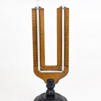 Instruments científics Patrimoni moble - Eines i equips - Acústica FFUB-0085 Joc de diapasons per fer corves de Lissajous Diapasó Acústica Un diapasó és una peça en forma d’U feta de metall, generalment acer, les dues branques del qual vibren en ser colpejat, de manera que generen una freqüència acústica molt ben definida per una ona sinusoïdal. Com qualsevol instrument musical, l’element generador gairebé no emet so i és necessari un element d’amplificació, per la qual cosa es recolza la part que no vibra en la caixa de ressonància d’algun instrument o en qualsevol superfície rígida. El va inventar el 1711 John Shore, sergent trompeter de la cort anglesa. S’utilitzen com a referència per afinar altres instruments musicals. Desconegut 1870-1900 1870 1900 13 x 18 x 56 cm Acer|Fusta Desconegut Facultat de Física. Martí i Franquès, 1-11, 08028 Barcelona Sala del Deganat Desconeguda Roman Magrans Geis, 2007-2008 Bo Reserva (magatzem) Ganot A. "Tratado elemental de física experimental y aplicada y de meteorología", 8 ed. Paris, J. B. Bailliere, 1880, p. 266-267 JMH 2021. Falta el gran s'ha integrat amb L'ANTIC 190 per formar FFUB-0285 Protegit per dret d'autor No Santiago Vallmitjana Rico, Departament de Física Aplicada, UB|Joan Manel Hernández, Departament de Física de la Matèria Condensada, UB